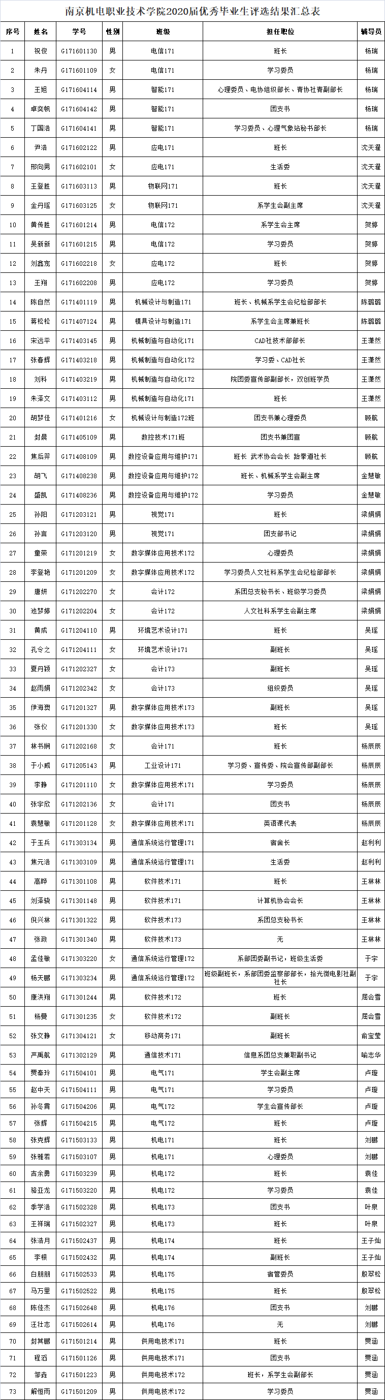 根据南机电院 学[2]号《关于评选2020届优秀毕业生的通知》,经班级评选,系部审核,学工处复核,决定拟推荐以下73名同学为2020届星空网页版登录入口优秀毕业生。现予以公示,公示时间:2020年6月24日—2020年6月30日。联系人:宁燕,电话:025-84190262,18061230078。