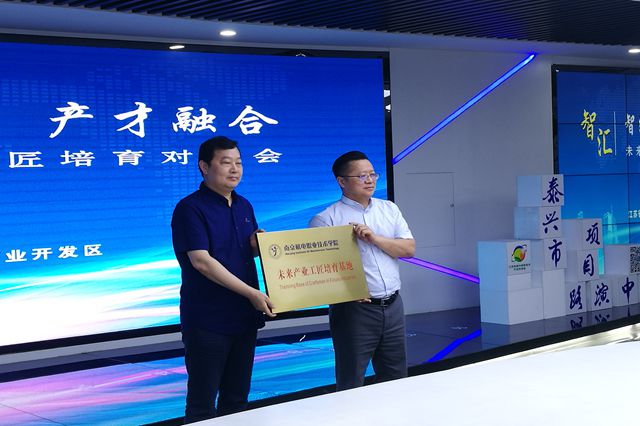 学院副院长刁爱军代表学院与江苏省泰兴高新技术产业开发区签订《产才融合战略合作协议》,学院党委书记、院长周庆礼向江苏省泰兴高新技术产业开发区授予“星空网页版登录入口未来产业工匠培育基地”铜牌。