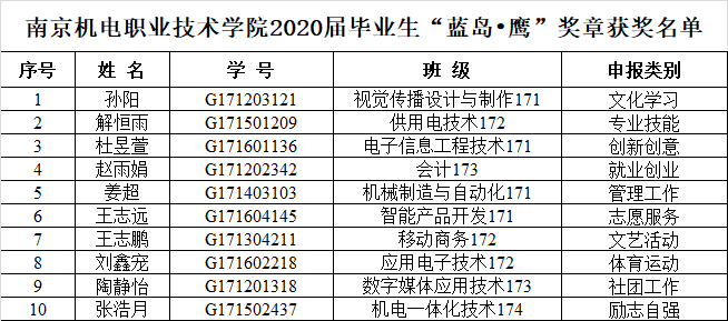 根据《星空网页版登录入口关于开展2020届毕业生“蓝岛•鹰”奖章评选推荐工作的通知》,经系部评审小组初步审核,学工处复核,专家评审组评审,决定拟推荐以下10名同学为2020届毕业生“蓝岛•鹰”奖章获得者。现予以公示,公示时间:2020年7月2日—2020年7月6日。联系人:宁燕,电话:025-84190262。