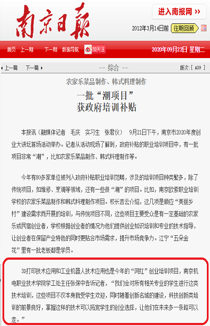 2020年921日下午,我院受邀参加了在南京市人力资源和社会保障局指导下,由南京市职业技术培训指导中心主办、南京市华普赢之道职业培训学校承办的南京市2020年度创业大讲坛首场活动。南京日报、现代快报、南报网等多家媒体对我院学生参与创业、技能培训项目的相关情况进行了采访和报道。