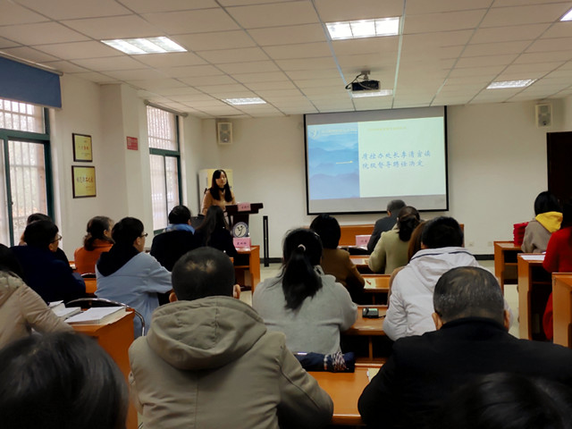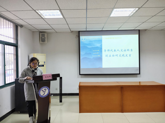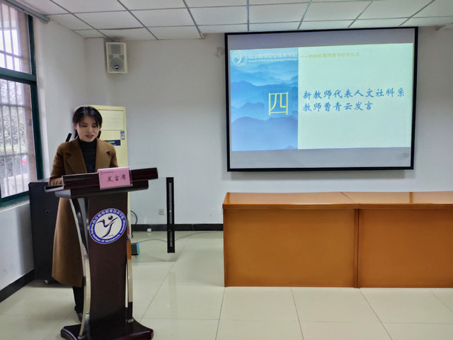 人文社科系曹青云老师作为新进教师代表也进行了发言,她表达了要虚向导师们学教学方法、学科研方法的强烈愿望,以及要努力提高教学质量、业务水平的信心和决心。