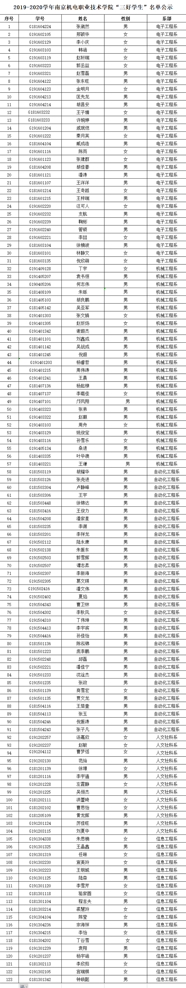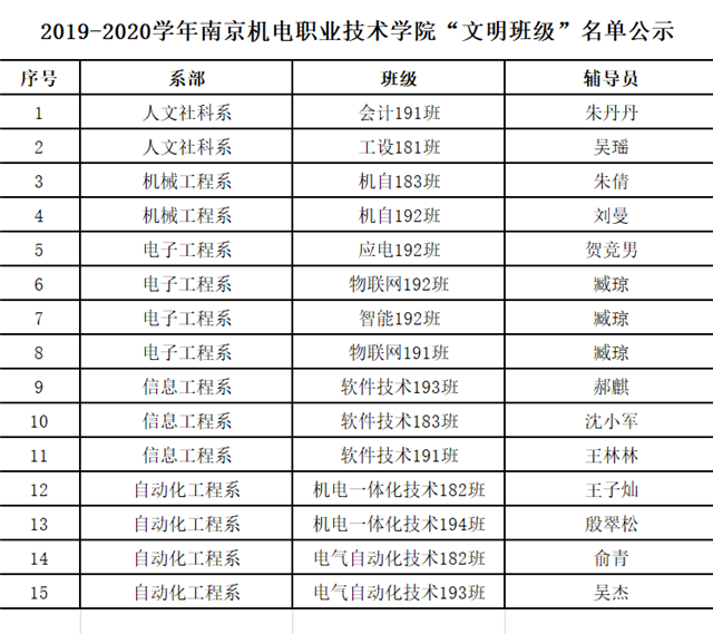 根据《星空网页版登录入口2019-2020学年三好学生、优秀学生干部、文明班级评选通知》规定,经学生本人申请、班级评议,系部审核推荐,学工处核准,学校审批,在公平、公正、公开的基础上,拟评选出以下个人和班级为2019-2020学年星空网页版登录入口“三好学生”、“优秀学生干部”、“文明班级”,现将名单公示如下。
