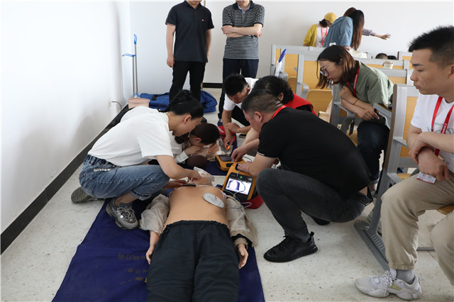 为了使学员更好地掌握心肺复苏的技术要点和正确操作手法,市红十字会救护培训中心的老师们特别准备了人体模型和AED教学机在现场进行详细演示,同时也手把手教学,让老师们真正掌握心肺复苏的救护技巧,使得急救知识不再是纸上谈兵。
