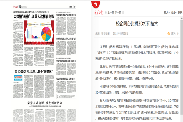由我校承办的2021年南京市职工职业(行业)“威布杯”3D打印技能竞赛反响热烈,受到了新华日报,南京日报、现代快报、南京电视台、高淳电视台等多家媒体刊登报道。