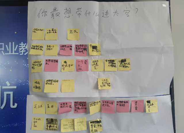 接着,黄老师带着学生们进行了“航天创意激荡”活动。学生们以把各种创意载荷带入太空为主题,开展头脑风暴,把学生们的奇思妙想展示在白纸上,描述了自己对未来空间站、太空城市、月球科研站、航天员食品、航天员训练器材、航天员娱乐设施、航天服、空间站用品的想象。