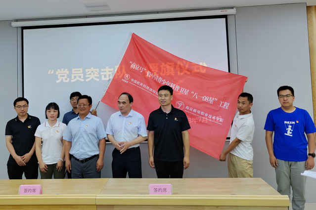 签约仪式结束后,举行了卫星工程“党员突击队”授旗仪式,中国航天科技国际交流中心副主任周岫彬和我校党委书记、院长周庆礼共同为“南京号”中国青少年科普卫星“八一08星”科普工程研制“党员突击队”授旗。卫星工程副总指带领我校“党员突击队”,以“赶进度、保质量、促成功”为目标,进行庄严宣誓。