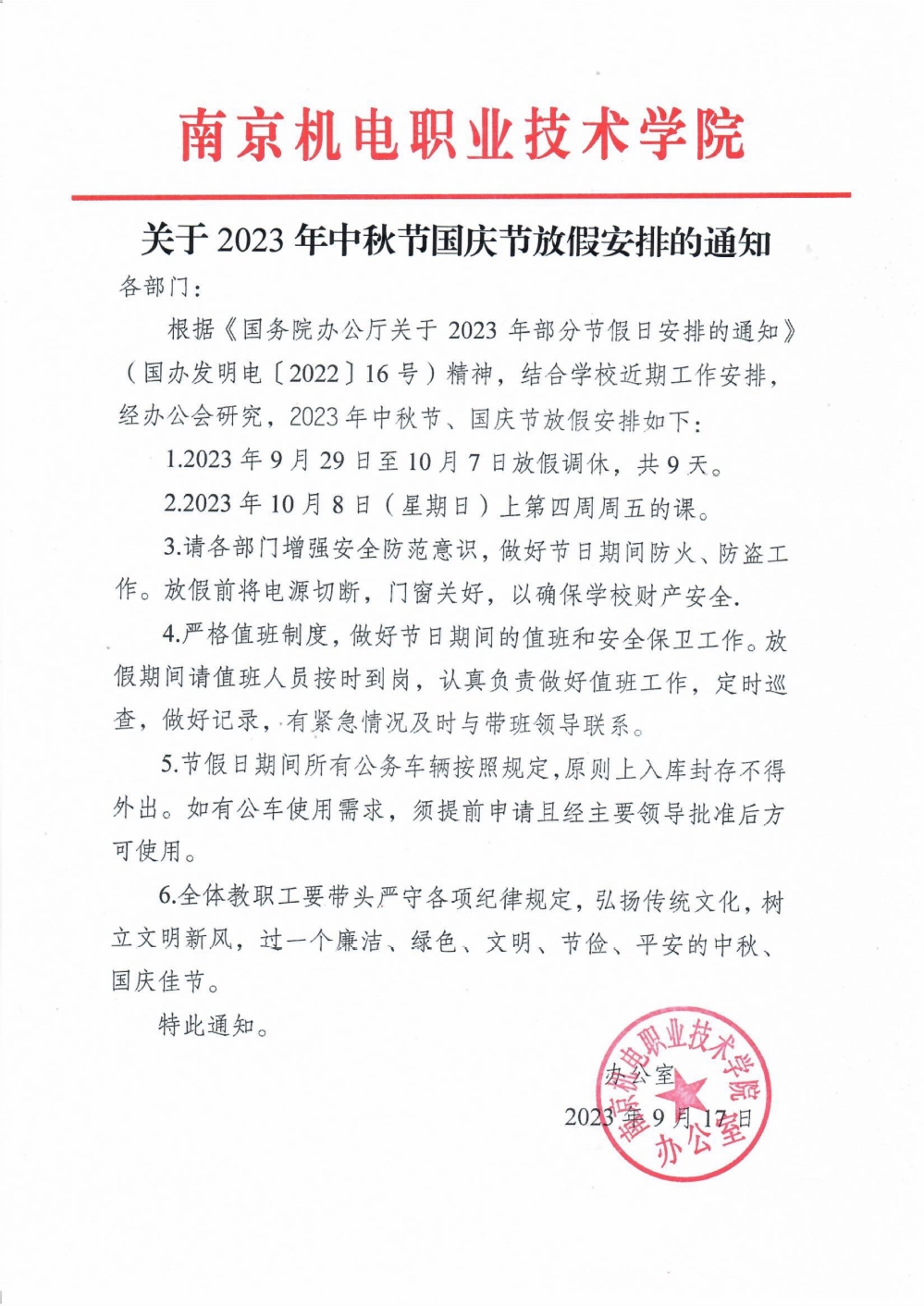 关于2023年中秋节国庆节放假安排的通知
