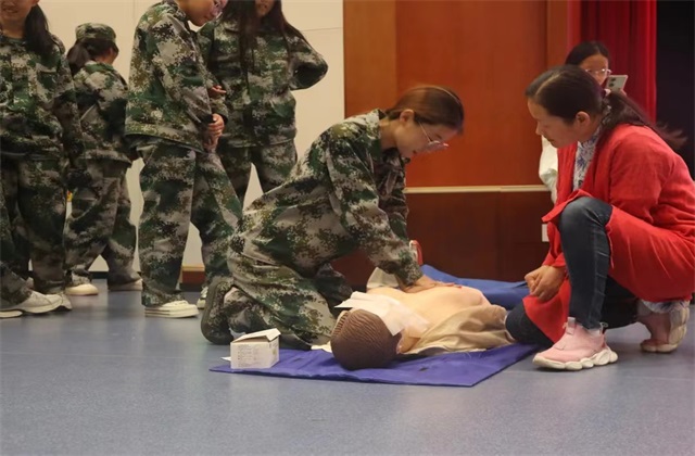 实操环节,老师们用人体模型给学生现场演示心肺复苏的完整操作流程,并让每位学生进行了现场实操练习,过程中强调了使用自动体外除颤器等注意事项,结合现实情境进行演示,用专业的技术和娴熟的手法演示了成功救助的全过程,迎来了现场阵阵掌声。理论加实践的有机结合,高效的让每一位学生学会了应急救护和意外伤包扎等基本操作。