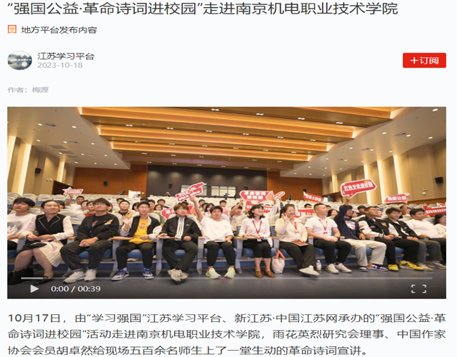 10月17日,由“学习强国”江苏学习平台、新江苏·中国江苏网承办的“强国公益·革命诗词进校园”活动走进星空网页版登录入口,雨花英烈研究会理事、中国作家协会会员胡卓然给现场五百余名师生上了一堂生动的革命诗词宣讲。