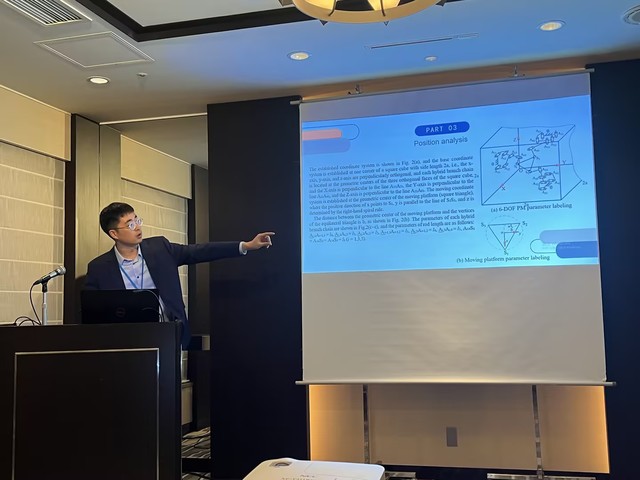 大会上,我校赵一楠老师以第一作者发表了论文《Structure Coupling-reducing Design and Closed-form Solution of a Three-translation Parallel Mechanism》,并于11月6日进行了论文宣读,引发同行的广泛关注与讨论。同时,赵一楠老师以合作作者身份发表了论文《Design of a three-chain 6-DOF symmetrical parallel mechanism and solutions of its forward and inverse kinematics》。