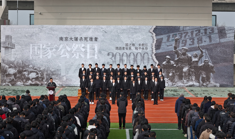 上午十时整,全校师生面向国旗台肃立,齐声高唱国歌,国歌唱毕,随着防空警报的拉响,全体师生为南京大屠杀死难者沉痛默哀。