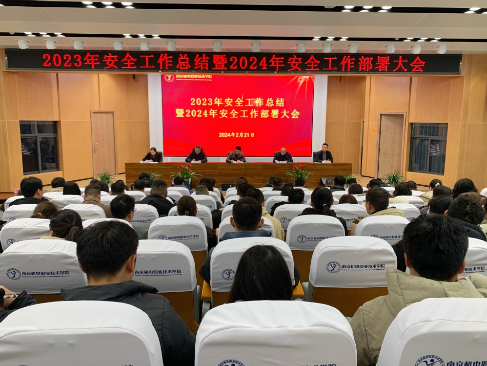 2024年2月21日,我校在乐学楼报告厅举行2023年安全工作总结暨2024年安全工作部署大会,学校党政领导出席会议,安全工作组成员、各部门负责人、系部主任和书记、安全员、驻校服务单位负责人及维保服务单位负责人等近100人参加会议。