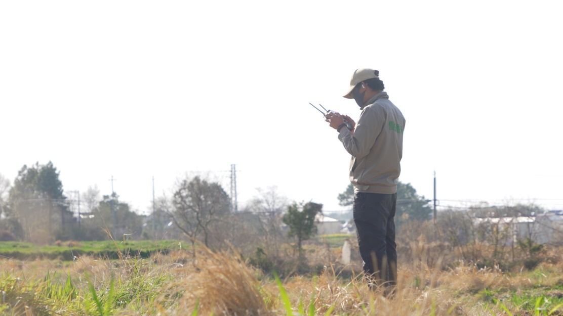 伴随着螺旋桨的轰鸣声,一阵风卷起地面的尘土,一架无人机腾空而起,预防病虫害的农药从喷口中均匀洒出,形成细密的雨雾,轻轻覆盖在麦苗上,在阳光下闪闪发光。