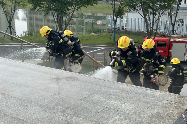消防演练以二楼学生餐厅为模拟点,在接到火警命令后,消防站指导员现场指挥,消防员快速铺设水带、打开消防车水箱接口、连接水枪进行灭火,择机架起移动排烟风机协助排烟,学校安保人员通力做好各项外围配合工作。