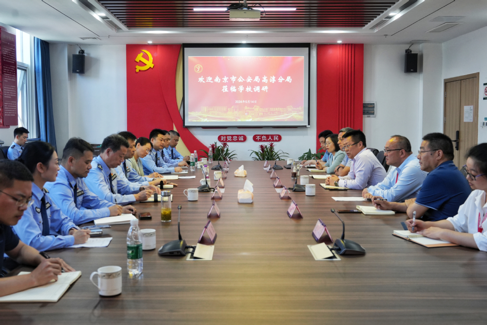 2024年5月14日高淳区政府党组成员、公安分局党委书记、局长陆炼带队,公安分局党委委员、副局长李春华,区内保大队、政保大队、交警大队、网安大队、古柏派出所等领导莅临我校专题调研校园安全工作,南京高职园党工委书记刘宜军,南京高职园党工委副书记、管委会主任孔桂红,高淳区教育局副局长甘育珍,南京高职园党工委委员汪笑云,学校党委书记、校长周庆礼,学校党委副书记、副校长赵学洪,党委宣传部,学工处,保卫处负责人等参加座谈。