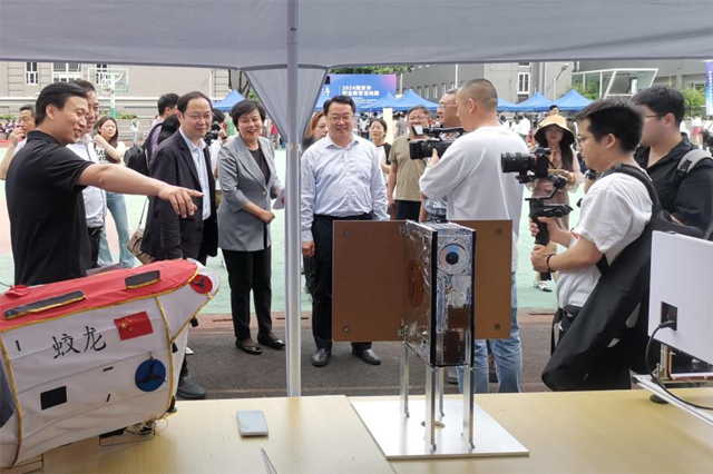启动仪式结束后,与会代表共同参观了“智改数转”职业技能教学场景展示、技能传承中华优秀传统文化展示及全市职业学校学生社团活动展演,全市20多所中高职院校,围绕活动主题搭建了各具特色的展区。星空网页版登录入口带来了“南京号”暨中国青少年科普卫星(八一08星)地面模拟星、“蛟龙”号秦淮花灯以及众多体现了数字化设计与制造的创客作品。