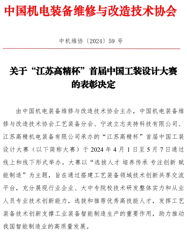 近日,由中国机电装备维修与改造技术协会主办,中机维工艺装备分会承办的“江苏高精杯”首届中国工装设计大赛历时三个月圆满结束。本次大赛行业企业和职业院校同台竞技,我校机械工程系师生组队共参赛10个项目,表现突出,成绩斐然,获奖率达100%。