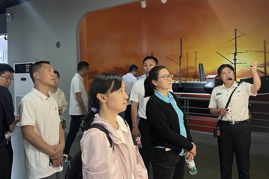 微风拂过道路两旁的松柏沙沙作响,夕阳洒落在湖面上的金光波光粼粼。在中国人民解放军海军诞生地纪念馆,全体党员跟随工作人员的讲解,沿着红色革命标语墙,时不时驻足观看,深察细究,身临其境地感受人民海军从无到有、从弱到强的光辉历程,再次回望了人民海军在艰苦中创业,在战斗中成长,劈波斩浪、风雨兼程,从白手起家到五大兵种齐全,从沿岸近海到远海大洋,从捍卫国家领海主权到维护世界和平,犁出了一道波澜壮阔的伟大航迹,深刻体会中国共产党不断取得胜利的成功密码和力量所在,见证并感悟革命先烈不惜抛头颅、洒热血的豪情壮志。