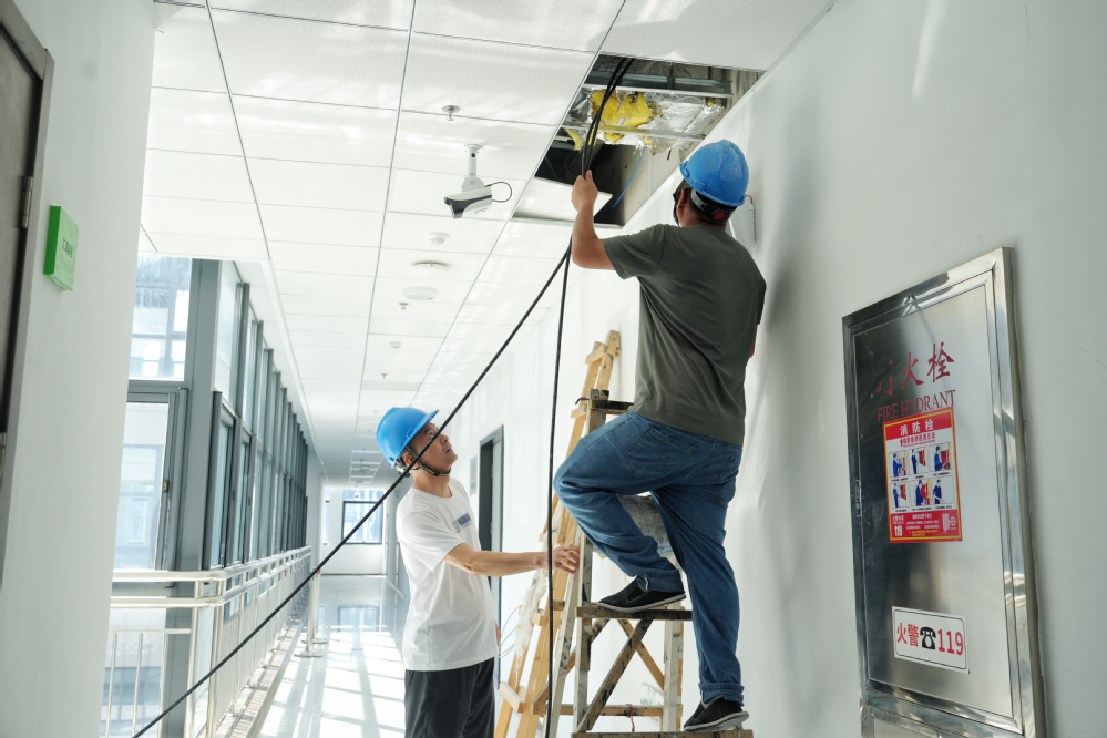 维修保障人员手握工具、辛勤劳作,奔赴于校园的各个角落修理维护校园设备。工程师傅们抢抓时间节点,全力以赴推进暑期维修改造,对户外设施设备及用电设备进行了细致地检查,及时发现并解决了存在的安全隐患。关键设施的测试和螺丝紧固工作也有序进行,确保了设施的稳固和安全运行。
