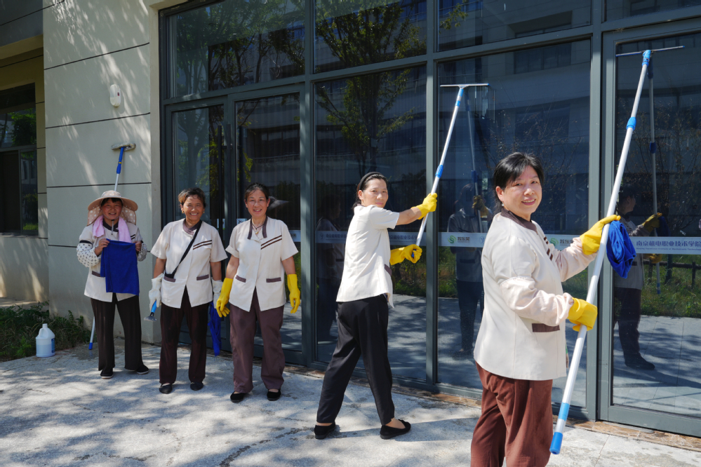 宿管阿姨们在高温下也坚守着岗位,确保宿舍园区整洁与卫生。阿姨们对宿舍楼梯间的墙面和地面进行了深度清洁,不锈钢扶手也得到了专业的清洁保养,不仅提升了宿舍区域的卫生标准,也延长了设施的使用寿命。