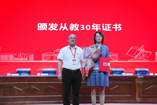 学校党委副书记、副校长赵学洪为郁镭老师颁发从教三十年证书,党委书记、校长周庆礼为郭朝辉、董志鸿两位退休教职工颁发荣休证书,感谢老同志们为学校发展所做出的无私奉献。随后,27位新进教师现场进行入职誓言。