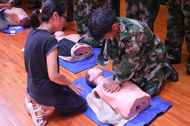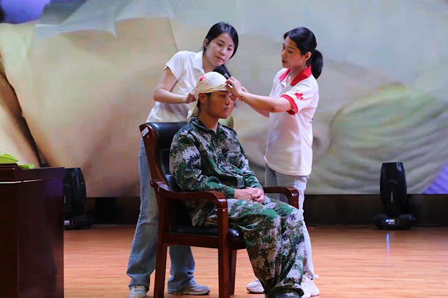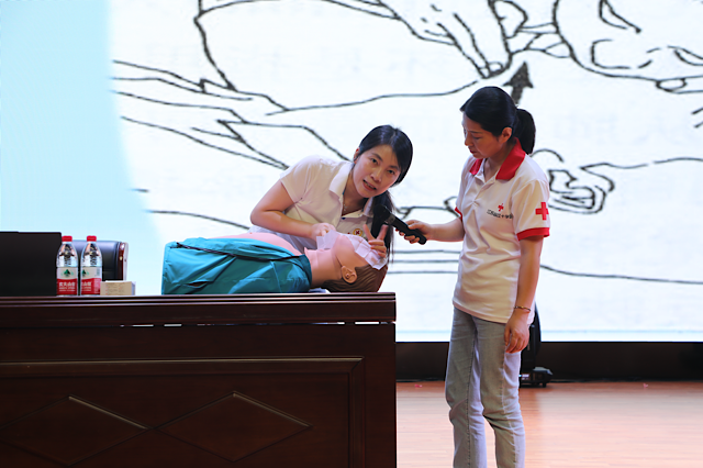 实操环节,老师用人体模型进行演练。在老师们的指导下大家依次在人体模型上演练人工呼吸、心肺复苏技能。专业的技术和娴熟的手法演示让同学们迅速掌握了应急救护和意外伤口包扎等基本操作。