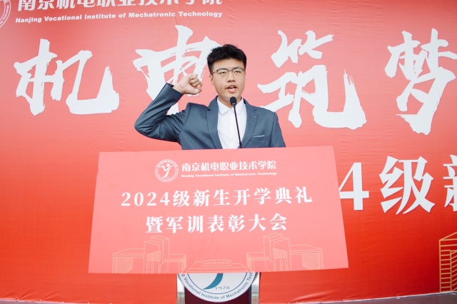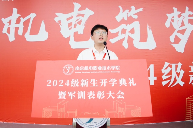 电子工程系张庭豪同学代表新生发言。他表示将以更加饱满的姿态,更加坚定的信念,更加扎实的行动去对待新的起点,成为更好更强的南机电学子。在张庭豪同学的带领下,全体新生庄严地进行了入学宣誓。