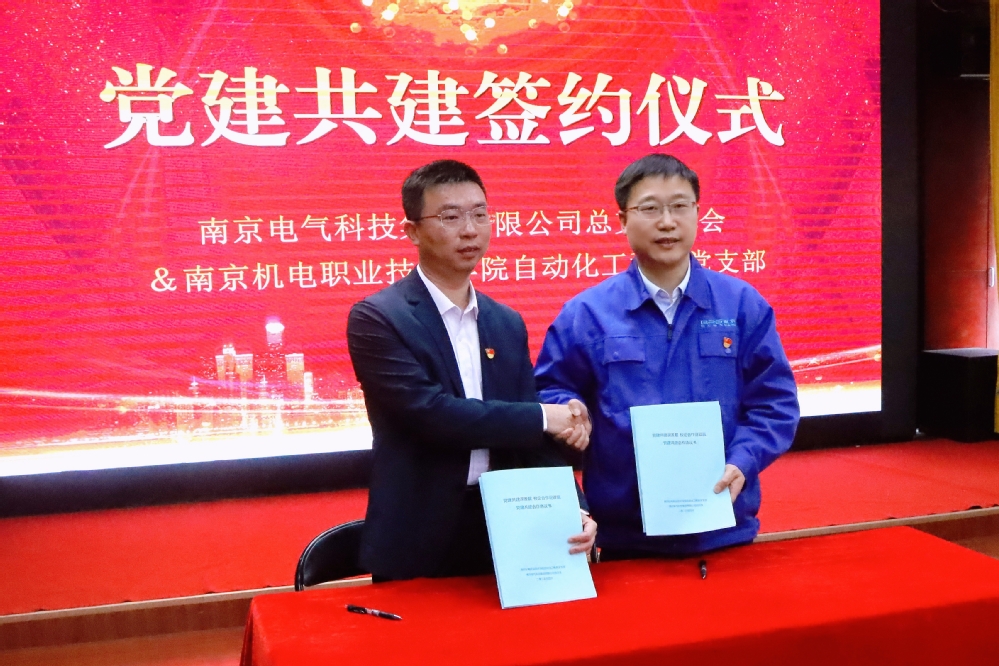 南京电气科技集团有限公司党总支书记邓军文和自动化工程系党支部副书记杨军共同签署结对共建协议书。双方商定,以党建共建为契机,以党建引领促发展为主题,锚定产、学、研、用深度融合目标,本着“资源互补、优势互补、注重实效”的原则,梳理党建资源,搭建共享平台,发挥双方党组织和党员作用,通过组织联建、资源联享、人才联育、发展联促模式,探索“以共建促党建,以党建促发展”的校企共建共享发展模式,携手激发基层党建活力,切实把党建联建共建优势转化为推动双方事业高质量发展成效。