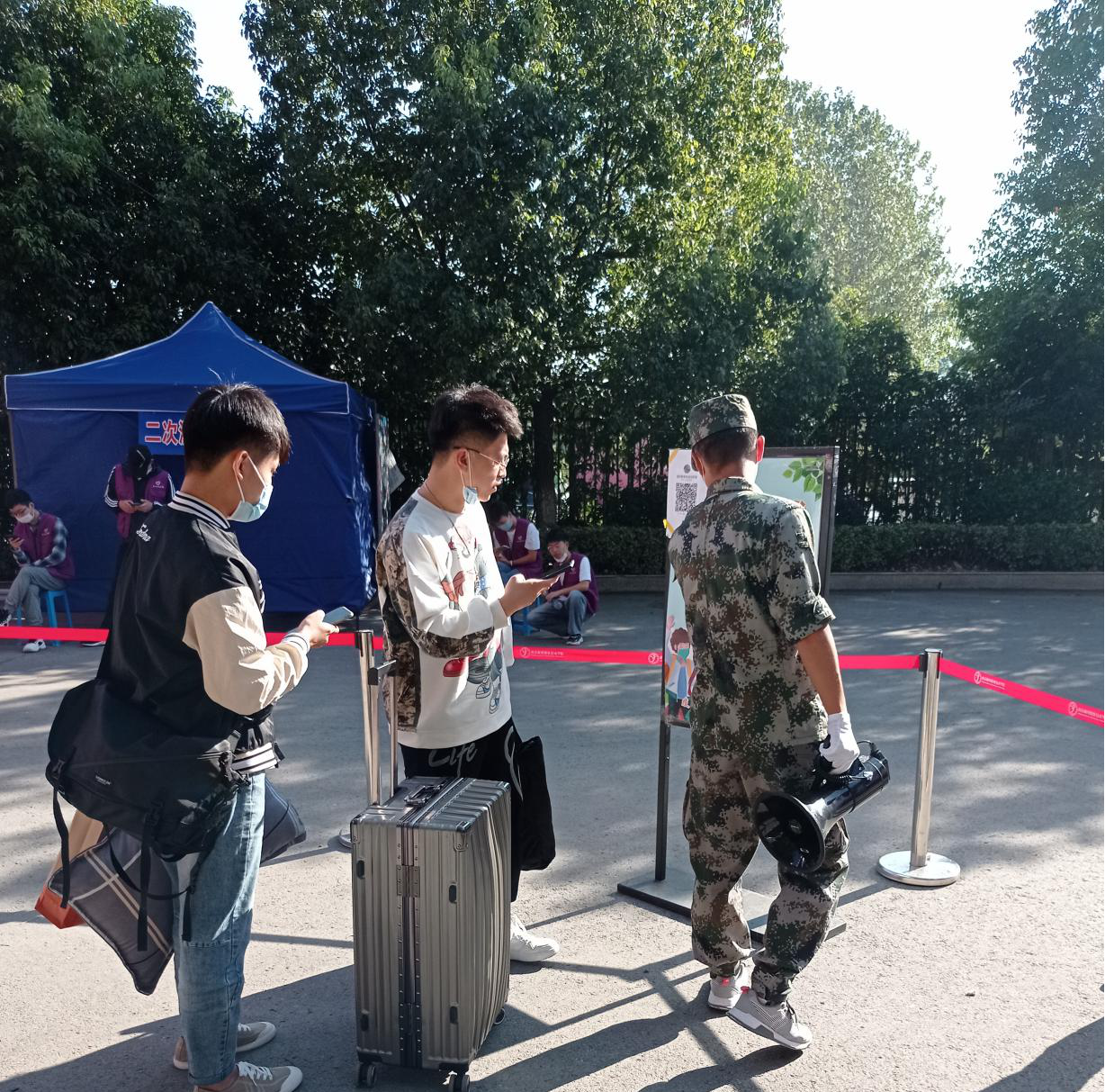 早上微凉的天气和昏暗的晨色丝毫没有阻挡我们工作人员热情洋溢的脚步,在欢声笑语间便扫走了大家一夜沉睡的疲惫,志愿者们满怀热切地等待着新成员们的到来。他们各司其职,相互配合,为迎接新生尽心尽力。他们在校门口为新生测体温、消毒、扫苏康码、进行“今日校园”APP上的信息核验等等工作,看似复杂繁琐但一切都有条不紊的进行,他们表现出高度的热情和责任感给新生家长留下了深刻的印象。