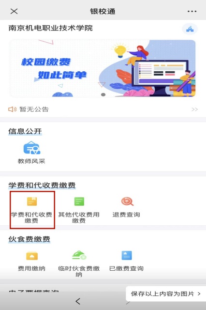 1.进入操作主页后,点击的是第一个黄标“学费和代收费缴费”,不要点绿色标志的“其他代收费用缴费”;