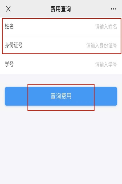 2.在费用查询界面中,输入姓名和身份证就可以了,学号统一不填写。