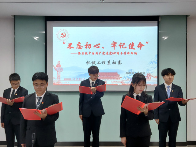 机械工程系团总支在系部党支部领导下,开展了以“‘不忘初心、牢记使命’—— 暨庆祝中国共产党建党100周年”为主题的诗朗诵比赛。参加本次比赛的队伍共计14支,邀请了资助中心主任孙晓燕、机械工程系教师邵加丽、团总支书记沈婷婷担任大赛评委,秘书部部长庄恒担任主持。