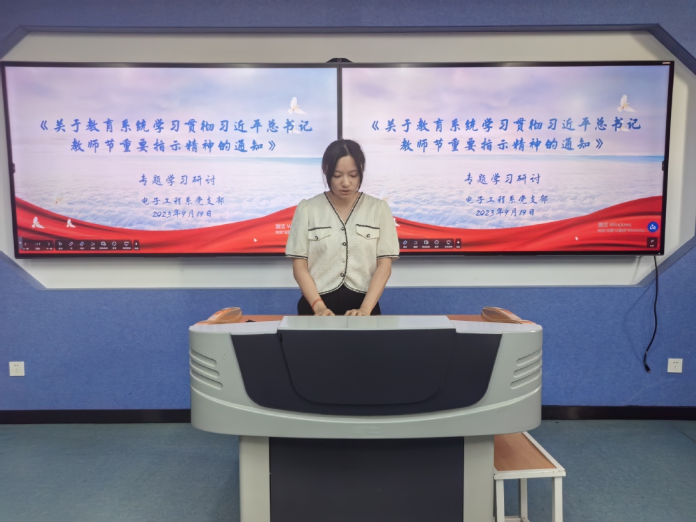 2023年9月19日,电子工程系党支部在思学楼411开展关于学习贯彻习近平总书记教师节重要指示精神专题研讨会,本次会议由党支部副书记唐钰峤主持,所有系部党员参加学习。