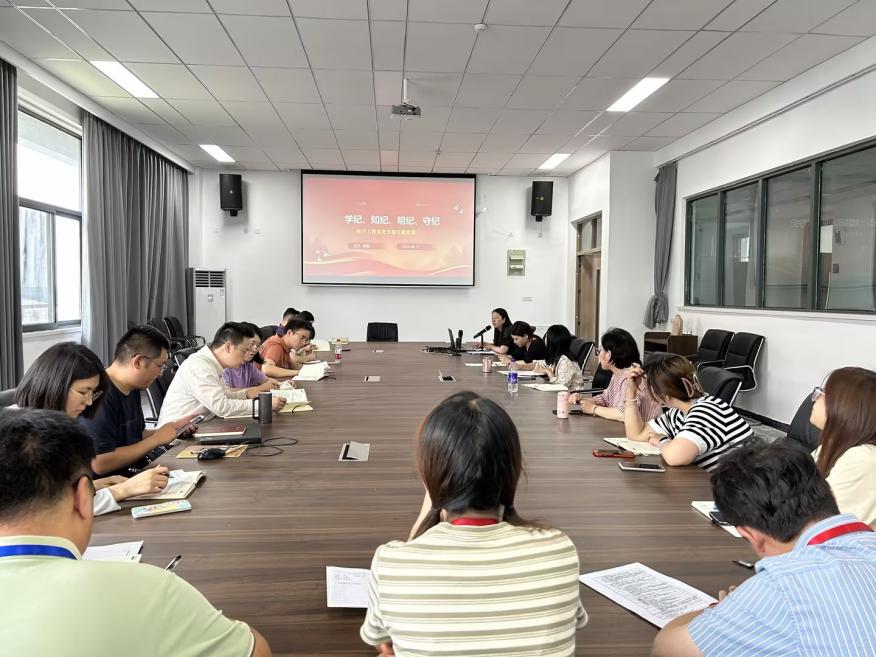 为了进一步落实《中共中央办公厅关于在全党开展党纪学习教育》的通知和上级党委以及校党委《关于在党员干部中开展党纪学习教育工作方案》,结合系党支部开展党纪学习教育的具体学习方案,2024年6月11日,电子工程系党支部开展了“学纪、知纪、明纪、守纪”的专题党课,党课由系党支部副书记陈雪主讲,电子工程系全体党员参加。