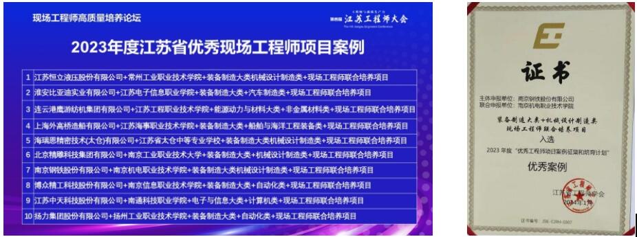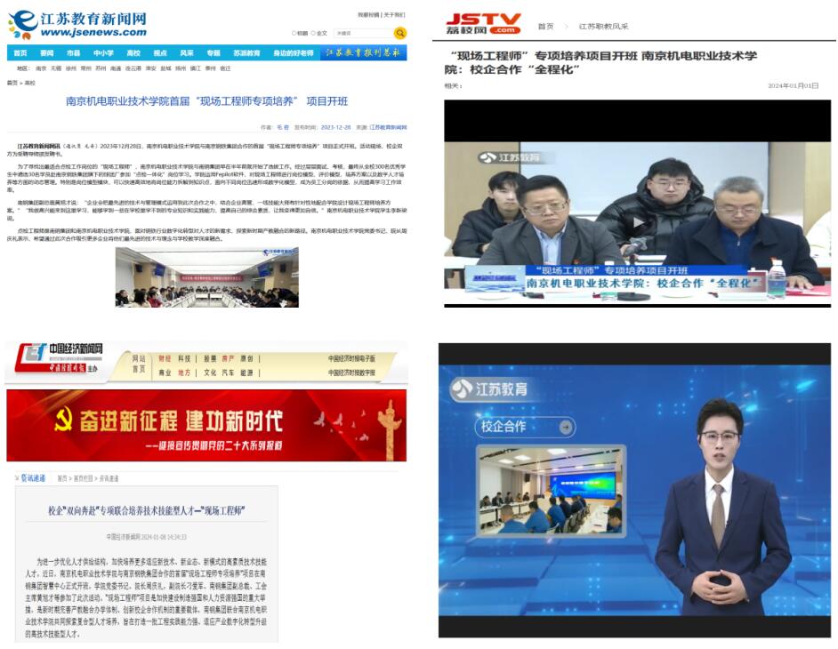 2023年专业与南京钢铁股份有限公司合作申报获批江苏省首批现场工程师培养项目。立项后,专业扎实推进项目实施,已进行两届学招生培养。得益于项目推进的高效有力,南京机电-南钢现场工程师项目得到了江苏教育、中国经济新闻网、荔枝新闻等媒体的关注及报道,受到了社会及家长的广泛关注及认可。2024年该项目被江苏省工程师学会评为“优秀工程师项目案例征集和培育计划”的优秀案例。