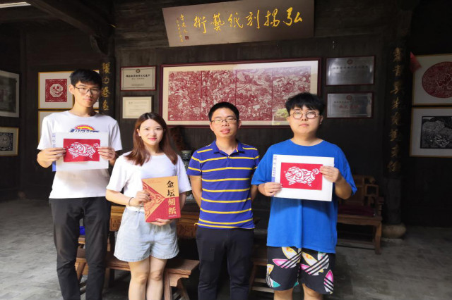 众所周知,金坛刻纸2009年入选“人类非物质文化遗产代表性名录”,成为了名副其实的世界级非遗。8月17日,朱倩老师带着学生们来到了金坛刻纸研究中心,在瞻仰了大师们的佳作之后,馆内工作人员王老师向团队成员详细讲解了刻纸的技艺特点,实践出真知,在听完老师的讲解之后,团队成员悉心体验了两天刻纸技艺,在反复的练习和摸索中,学生们逐渐掌握了一些技巧,比如:刀口不宜过长;刀口与纸的角度要尽量小;施力要慢且均匀等。在实践中,学生们感受到了传统艺术的魅力,并从自己的实践作品中获得了满满的成就感。
