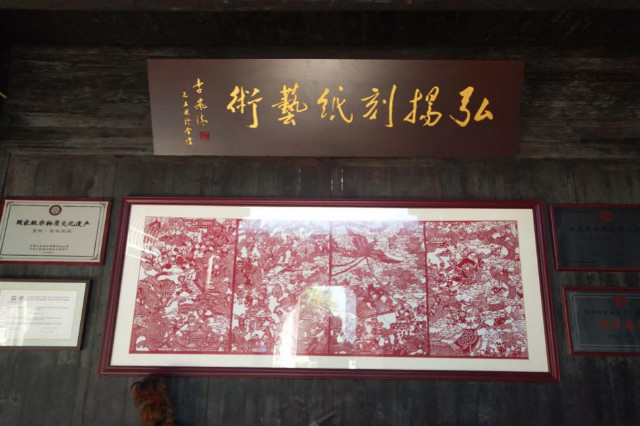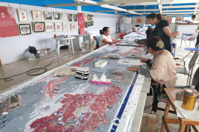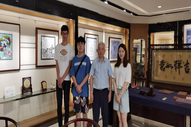 实践第七天,实践小团队来到了飞洋鱼制衣有限公司拜访杨兆群教授,杨教授亲自带领我们参观了正在刻制阶段的《大运河》长卷。他向学生们介绍,这幅长卷完工后,将成为现存刻纸作品中篇幅最大的一幅,并将在不久后展出。通过近距离的观察,小组成员们真切地感受到了刻纸长卷震撼的视觉效果和艺术传承人的工匠精神。