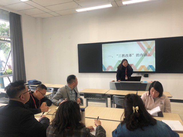 我们主要从以下四点进行了研讨:一、“三教改革”的内涵、“三教改革”的策略、“三教改革”的实施、“三教改革”的创新。三教:是指教师、教材、教法,“三教改革”之间的关系:教师是核心,教材、教法依附于教师。 观点:教师即教材,教师即教法。另一方面,教材、教法对教师的发展产生影响。职业教育基础地位的巩固,需通过“三教改革”,进行提质培优,转型升级。因此,对职业院校、教师而言,既是机遇,又是挑战。