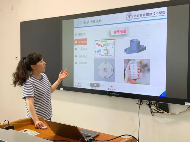 卢彬老师汇报的是《机械制图》课程,她分别从教学基本情况、教学设计思路、教学过程设计和教学反思四个方面来介绍教学设计过程。课程采用“任务驱动,项目导向”的教学模式,实施任务驱动法、案例分析法等教学方法,灵活运用动画、视频、三维软件等教学资源组织教学。在授课过程中融入工匠精神、劳动精神等思政元素,实现立德树人目标。