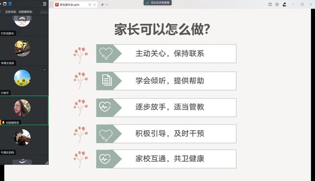 参会过程中,辅导员们为家长们提供了学生教育方面的帮助,明确了家校携手的合作方向,全体家长也认真学习,积极参与,用心感受,虽然是“云上相聚”,但是隔着屏幕依然可以感受到家长朋友们的热情,各班家长参会率都在90%以上。
