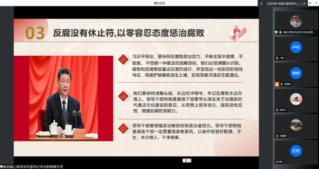 4月30日,机械工程系党支部召开政治理论学习会,学习习近平总书记在十九届中央纪委六次全会上的重要讲话和全会精神。机械工程系党支部副书记李杰授课,支部全体党员参加了学习。