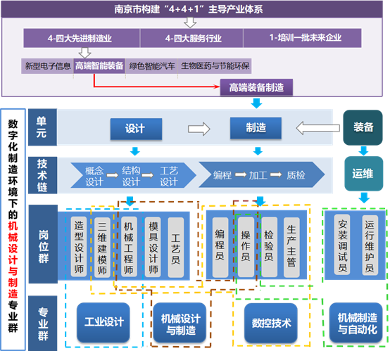 专业群组群逻辑图机械设计与制造专业主要对应于机械零部件产品全生命周期的数字化设计与制造全过程中的设计单元和制造单元,对应的技术链为结构设计、工艺设计和加工,适应的岗位(群)为高端装备的操作员、机械工程师、模具设计师和工艺员等。通过深化人才培养模式、重构课程体系、优化师资队伍结构、建设实训基地等措施提高人才培养质量,为专业群培养高端装备人才。