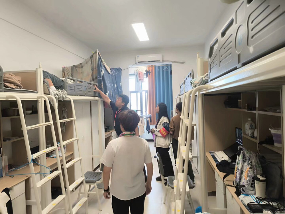 随后,检查队伍兵分多路,对润泽、博雅宿舍楼的各个楼层展开检查。每到一间宿舍,都仔细查看宿舍内是否存在烟头、烟具等违规物品,用电是否规范、物品摆放是否整齐、卫生状况是否达标等情况。此次检查特别聚焦7S检查评分低于80分的宿舍。胡枫针对具体情况提出整改建议。对于个别宿舍存在的杂物堆积过多等问题,要求同学们立即整改,提高安全意识。在禁烟方面,胡枫通过实际案例向同学们阐述了吸烟对个人健康和宿舍环境的危害,鼓励同学们自觉抵制吸烟行为,共同营造无烟宿舍环境。
