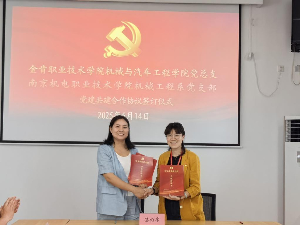 随后,胡枫与周秀珍分别代表机械工程系党支部与金肯职业技术学院机械与汽车工程学院党总支签订了党建共建协议,充分发挥党建引领作用,构建资源共享、优势互补的协同发展机制。