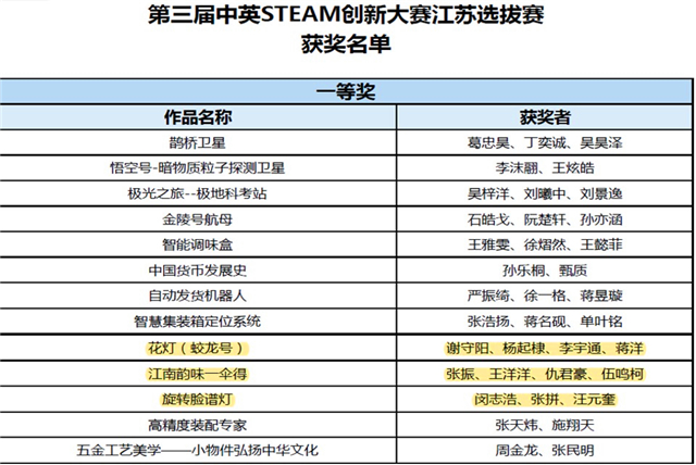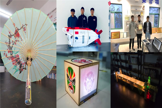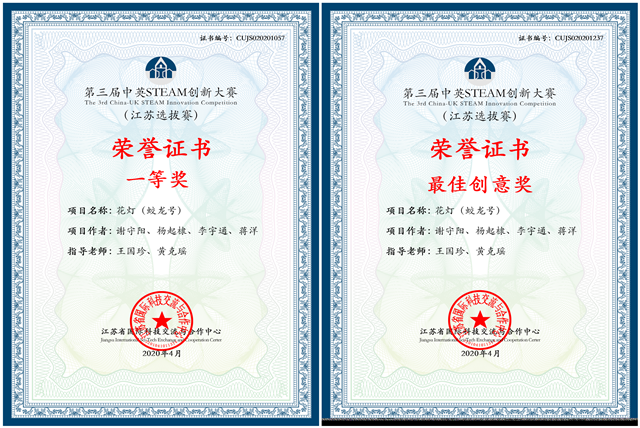 我院蓝岛创客空间对本项赛事高度重视,并于2019年11月启动了该项赛事的准备工作,向全院创客们发布了比赛通知,并对提交上来的创客作品进行了校内评审。在将近两个月的时间里,我院创客导师指导学生组成创客团队设计项目图纸、编写程序、完成创客项目、设计演讲ppt、拍摄作品展示视频,最终43名同学组成的14个创客团队成功入围第三届中英STEAM创新大赛江苏选拔赛的正赛环节。在两轮评审之后,我院创客谢守阳等同学的项目“花灯(蛟龙号)”、 张振等同学的项目“江南韵味一伞得”、闵志浩等同学的项目“旋转脸谱灯”荣获一等奖。其中“花灯(蛟龙号)”、“江南韵味一伞得”又分别获得最佳创意奖和最佳优秀作品奖。获得一等奖的创客团队成功入围决赛环节,他们将在英国与国外创客高手展开同台竞技与交流。同时,由于创客们的积极参与和出色表现,我院被赛事评为“优秀组织单位”。