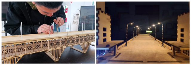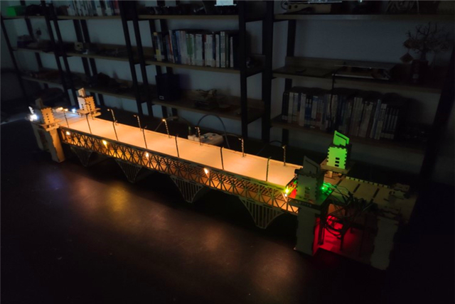 南京长江大桥是长江上第一座由中国自行设计和建造的双层式铁路、公路两用桥梁,在中国桥梁史上具有重要意义,创造了中国桥梁建设史上的许多新纪录,长江大桥是南京的标志性建筑、江苏的文化符号,也是中国的著名景点之一,以“天堑飞虹”列为新金陵四十八景之一。杜昱萱等同学组成的创客团队利用激光切割技术构造了微缩版南京长江大桥模型,在桥身安装了由Arduino控制的光敏电阻实现灯光效果,利用红外传感器、ICD液晶显示屏和蜂鸣器等设备模拟可视化大桥车流量监测系统和数字化精准限流系统。