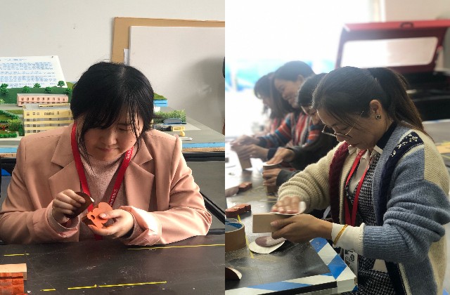 然后用抛光布在底座和主体上涂抹木蜡油进行抛光处理。在主体上用电钻安装吸铁石以便于党徽的摆放。最后,使用热熔胶粘黏主体和底座。活动中,教师们仔细打磨,耐心涂蜡抛光,一件件精美的作品在老师们的细心打磨下应运而生。