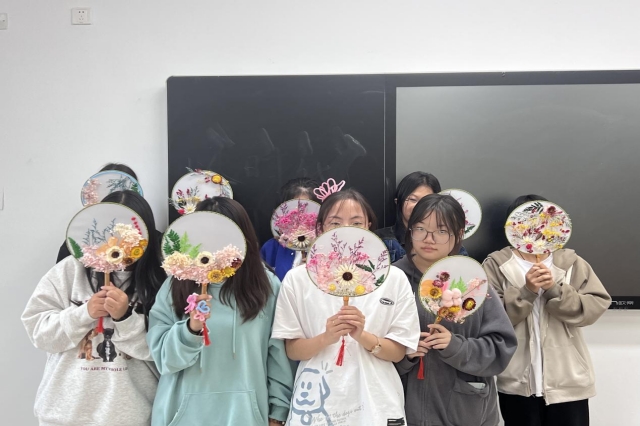 10月19日活动现场,人文社科系学生会给前来参加活动的同学准备了空白团扇、花材、胶水等材料和工具,人文社科系学生会主席杨闪悦和副主席马绍华一起给大家分发活动所需的材料,经过一系列的了解和学习,同学们充分发挥创意和想象力,用干花在团扇中任意搭配各种图案,并用胶水小心翼翼地粘住,固定好干花在团扇中的位置,大家相互观摩,一幅幅清新淡雅的团扇作品在每位同学的巧手下诞生了。