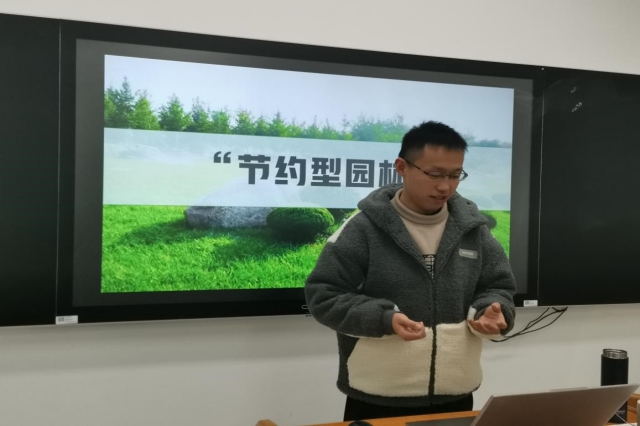 王老师从现阶段我国面临的生态问题出发,如土地皲裂、水污染等,结合“绿水青山就是金山银山”的理念,向大家分享了“节约型园林”设计这一新兴的设计策略。他简述了节约型园林的概念与类型等,以及分别对应的四个“节地”、“节水”、“节材”、“节能”设计手法,并以上述四种设计手法为例详细阐述了在室内空间与景观空间中的设计运用。最后,王老师以曾经做过的实际项目“溧阳市社渚镇田冲村特色田园乡村改造”为例,结合村庄实际给老师们展示了“节约型园林”设计在乡村景观空间中的具体运用方式。