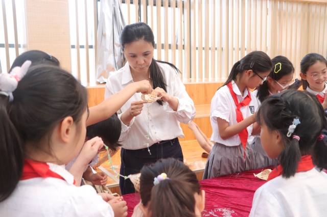 活动的重头戏——创新创意活动与亲子活动同步展开。创新创意活动区热闹非凡,多个特色项目吸引着孩子们的目光。在活动现场,随处可见团委志愿者们忙碌的身影。在非遗竹编项目中,专业竹编老师将“中国端午节”与竹编工艺巧妙融合,先讲解竹编文化与端午节的渊源,展示精美的端午节小舟风铃成品,激发孩子们的兴趣。随后,老师示范竹编步骤,志愿者们穿梭在孩子们中间,手把手指导他们用竹篾精心编织小舟,并鼓励孩子们发挥创意装饰竹子、荷花串珠、折纸粽子和艾叶,一个个充满端午氛围的小舟风铃在孩子们手中诞生。非遗锦灰堆文创制作项目也备受欢迎,专业老师介绍锦灰堆的历史、特点和艺术价值后,示范剪、撕、烧等操作技巧,志愿者们协助老师分发材料,提醒孩子们注意安全。孩子们分组创作,将书法与绘画印刷品制作出残破效果,再精心构图粘贴于书签和宣纸扇上,完成了一件件独具匠心的作品。
